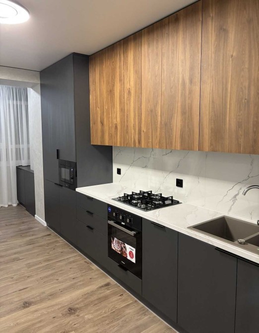 Кухня фурнітура Hefel, вбудована посудомийна машина Hansa, поверхня Hansa, вбудована мікрохвильова піч Interline, витяжка із сенсорним регулюванням Interline, газова поверхня Ariston Hotpoint, мийка одна із кращих Blanco.