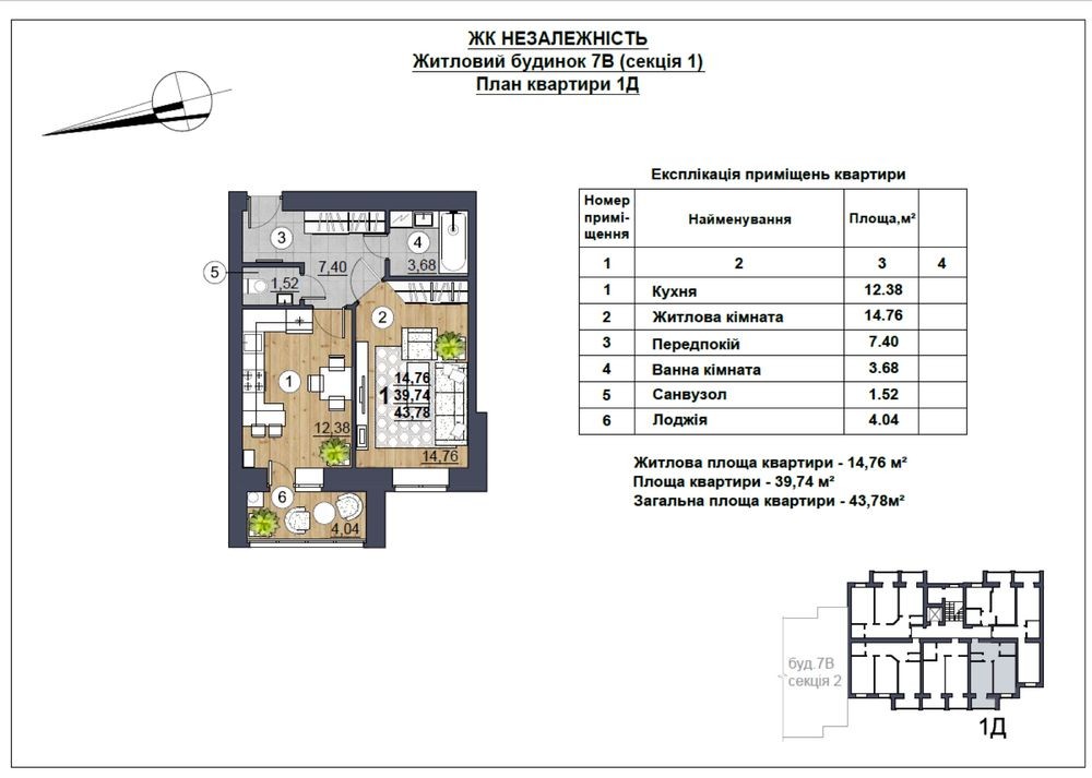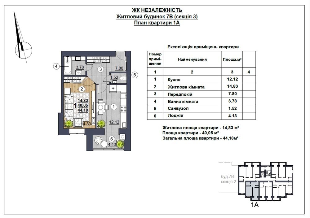 • Общая площадь 44 м2