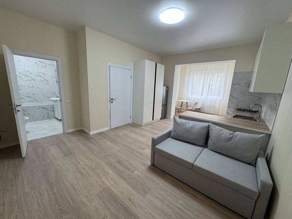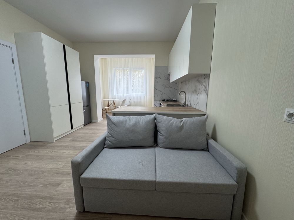 Окрема повноцінна кімната, з лоджією, кухня-вітальня з робочою зоною та місцями для відпочинку. Мебльована Кухня в іншій частині квартири, великий санвузол, де розміщені пралка, ванна, та все необхідне