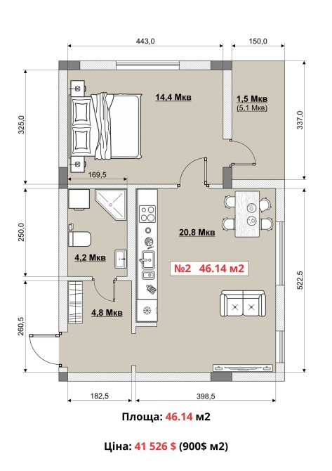 Ціна: 41 526$ ( 900$ м2 )