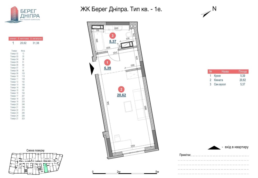 Однокімнатна квартира в ЖК Берег Дніпра, 31.3 м.кв. 1к