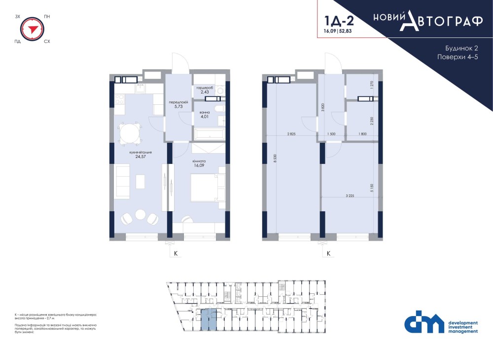 1к квартира в ЖК площею 53м2 з великою кухнею-вітальнею. Квартира знаходиться на 21 поверсі.