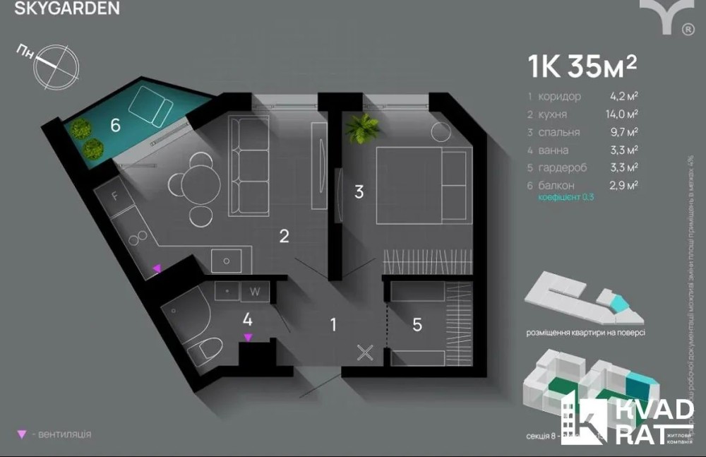 Квартира знаходиться на ідеальному 9-му поверсі з чудовими панорамними краєвидами.