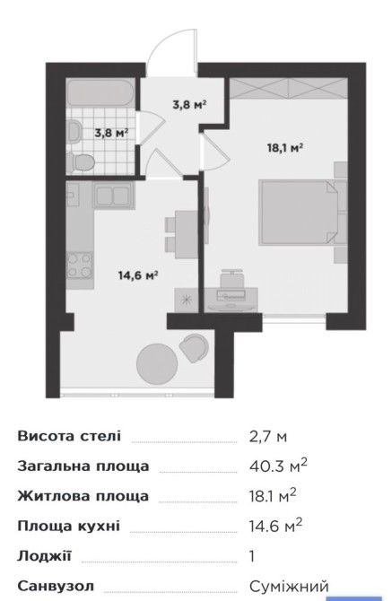 • Общая площадь 40.3 м2
