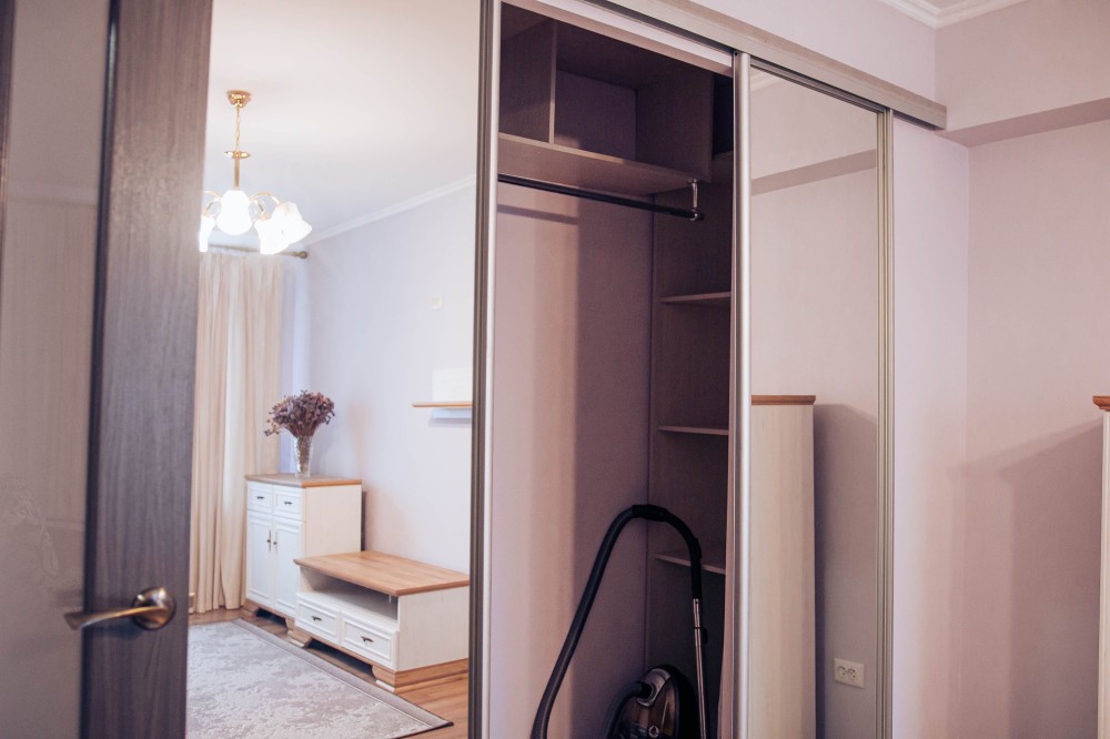 велика вбудована гардеробна з поличками та вішалками
