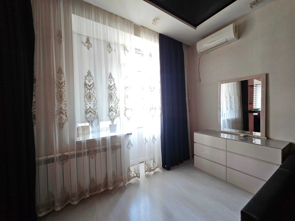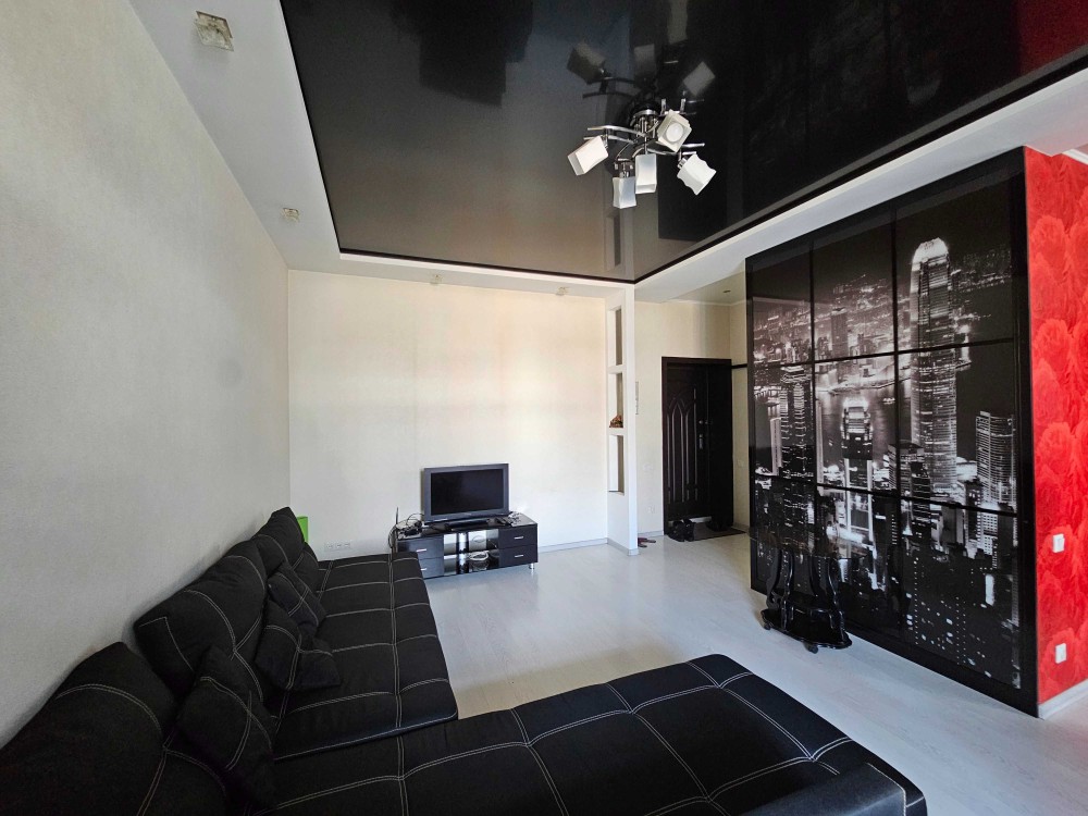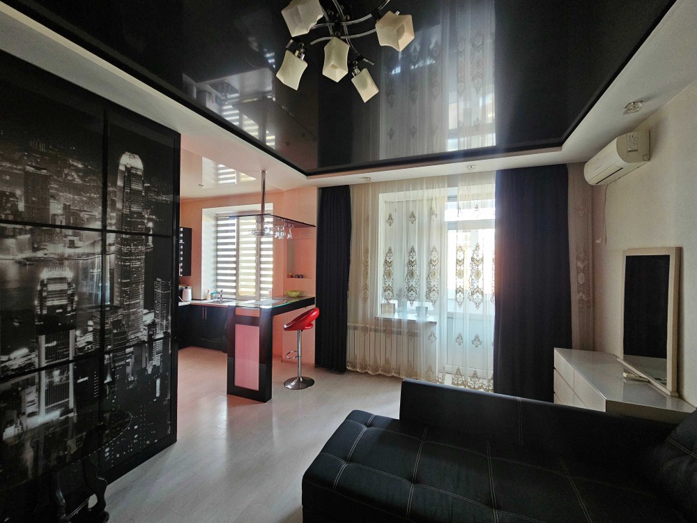 Квартира тёплая и светлая. В жилой зоне расположен большой раскладной диван, установлен кондиционер. Есть отдельная гардеробная, что позволяет удобно организовать хранение вещей. В интерьере использована декоративная штукатурка, на полу — ламинат, предусмотрено многоуровневое освещение и подсветки, создающие уютную атмосферу.