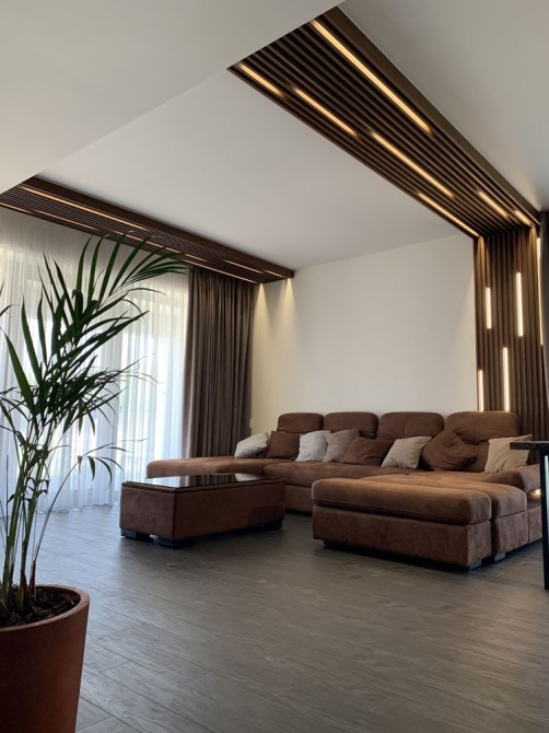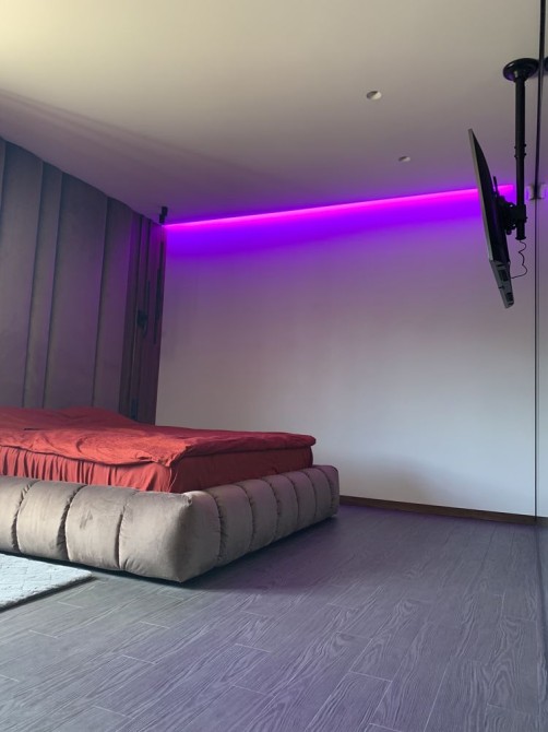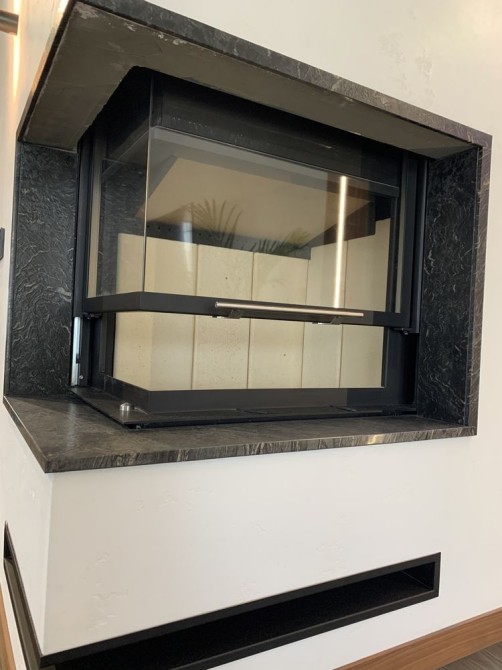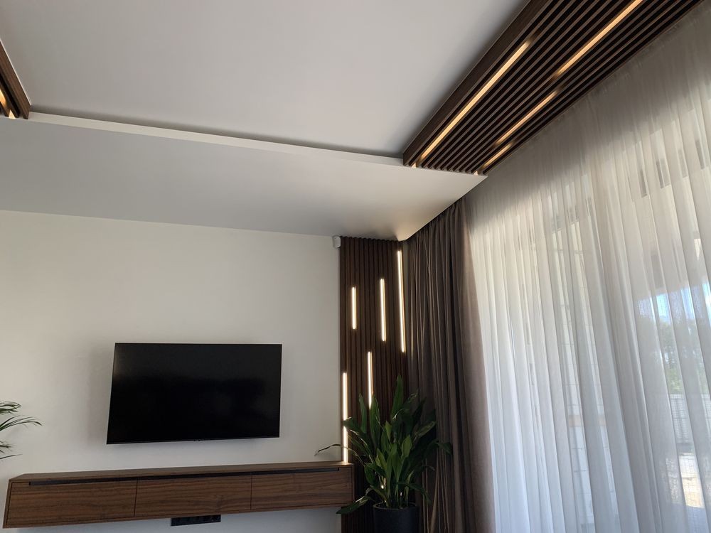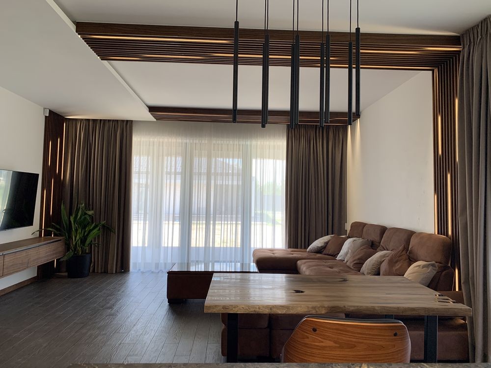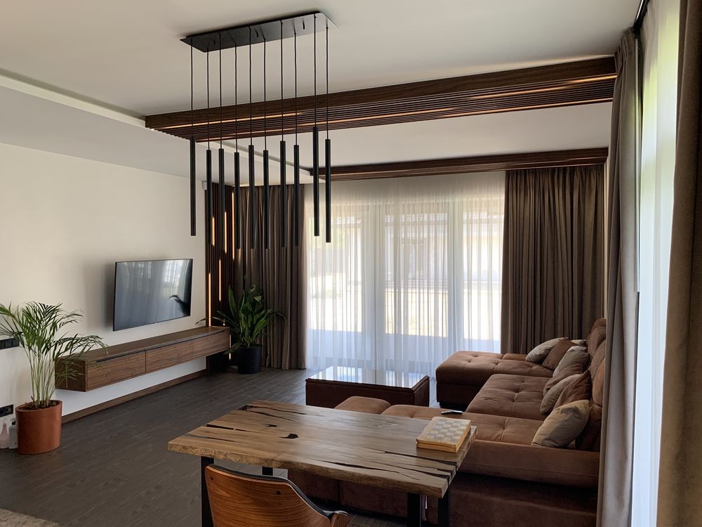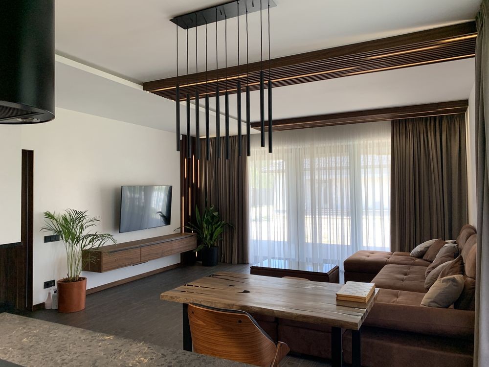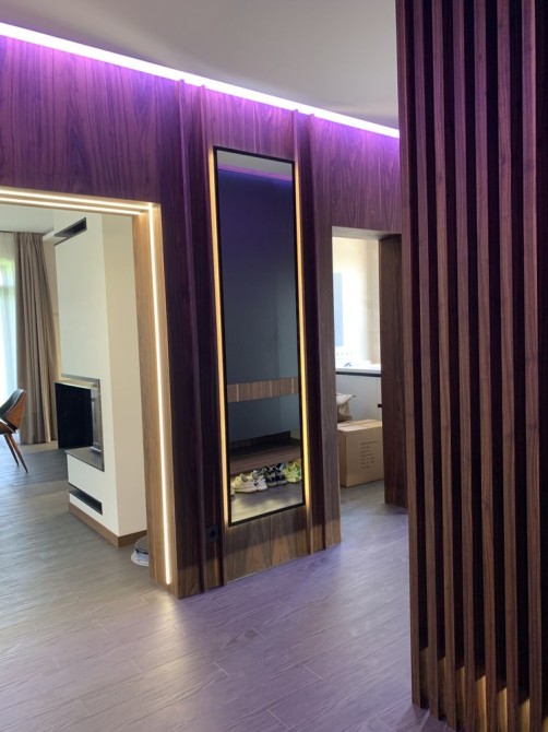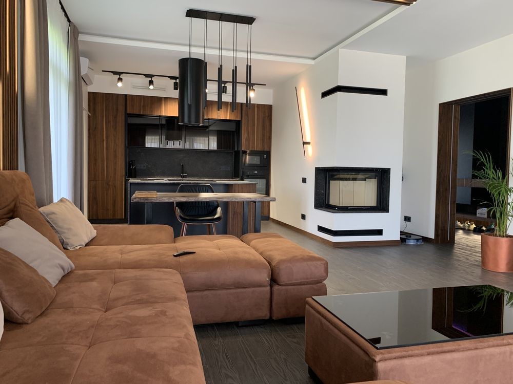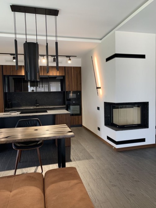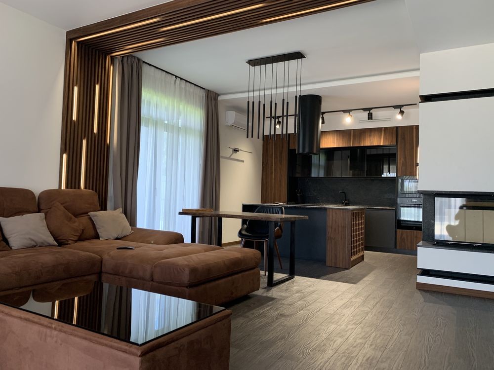 У залі камін - гільйотина, ТВ на стіні, розсувні двері, декоративне підсвічування, кондиціонер ...