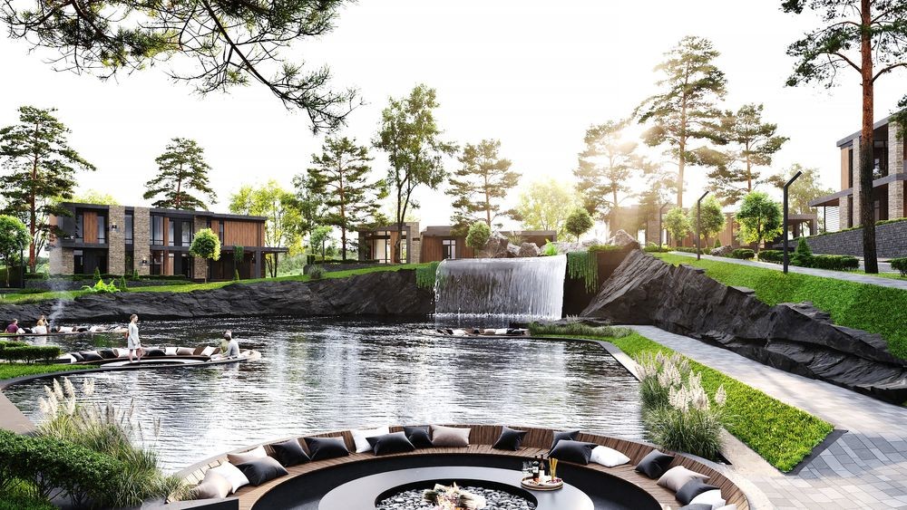 • на території облаштовується ландшафтний дизайн , насаджені дорослі секвої віком від 50 років . Облаштовується зароблене озеро та бурхливий водоспад