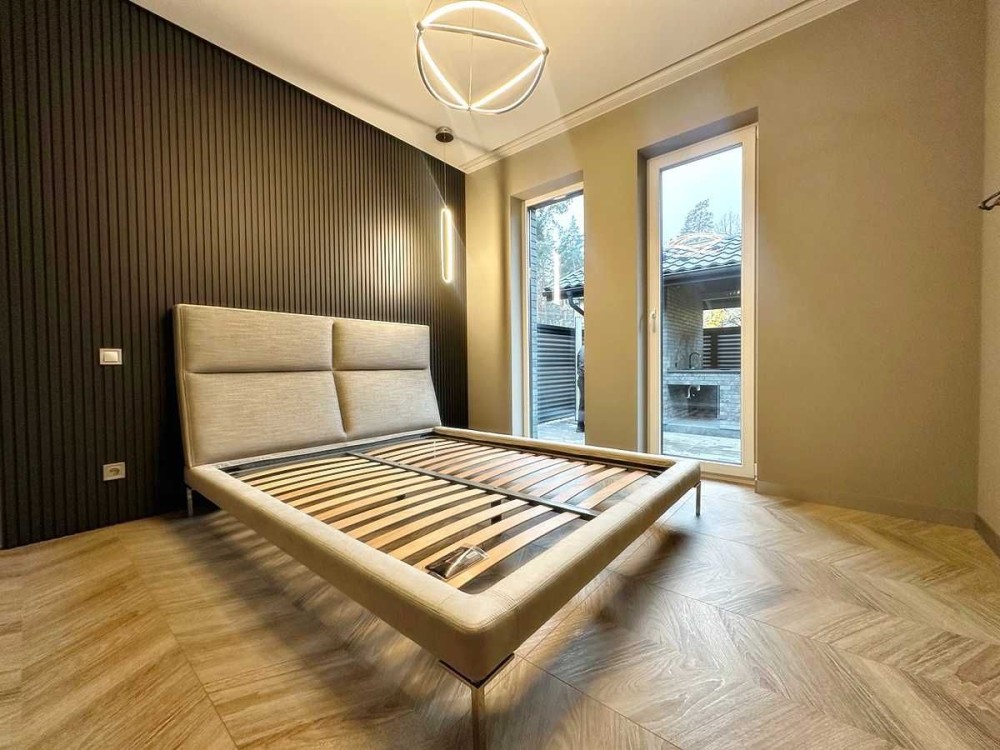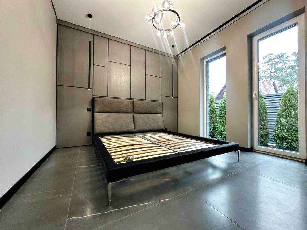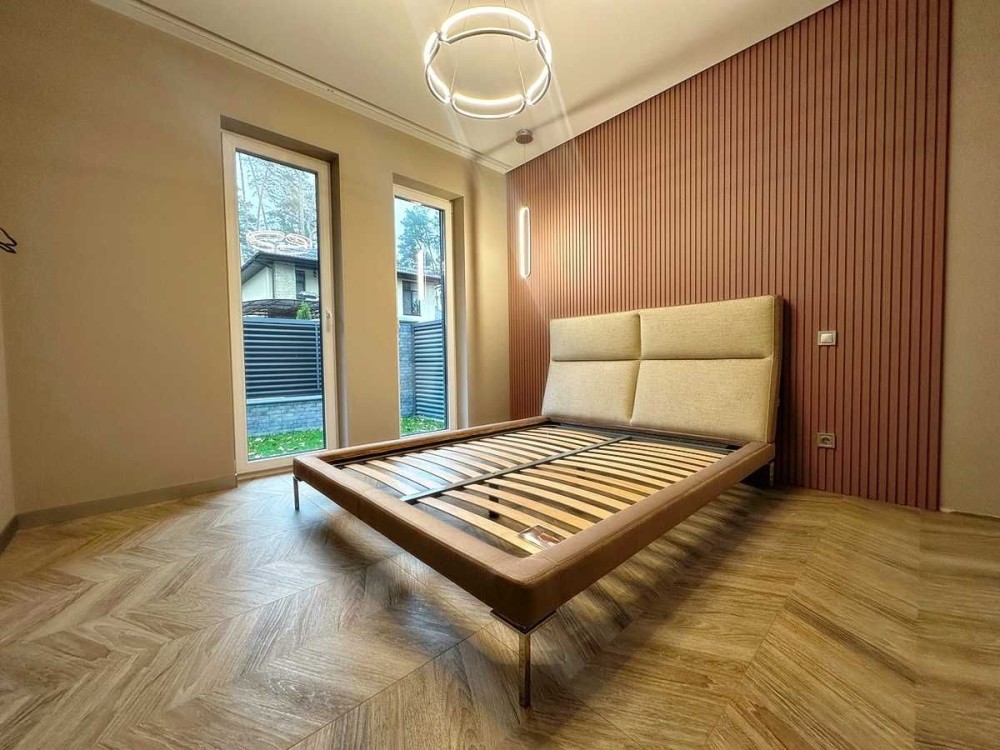 Вдале планування з великою кухнею-студією 47м2. З вітальні вихід у двір до альтанки облаштованої під зону барбекю, окреме приміщення для зберігання садового інвентарю та дров. Три окремі спальні з якісними ліжками, мастерспальня з власним гардеробом та санвузлом з душовою. Санвузол основний має і ванну і душову. Облаштована котельня з електрокотлом, бойлером, системою фільтрації води, велика гардеробна. По всьому будинку встановлено різні види дизайнерського освітлення. Високоякісні двері прихованого монтажу з покриттям під обробку стін. Стіни в спальнях – дизайн панелі, коридор оброблений слеб, натуральний камінь. Вже встановлено відеодомофон, охоронна система, зарядка під електромобіль.