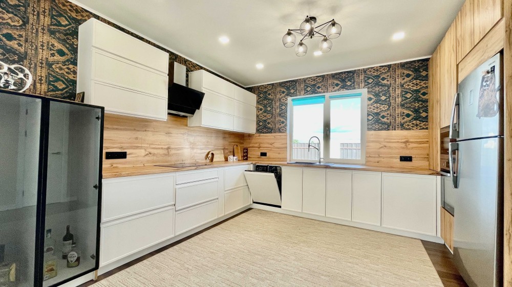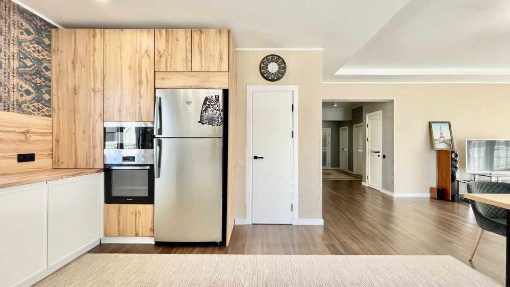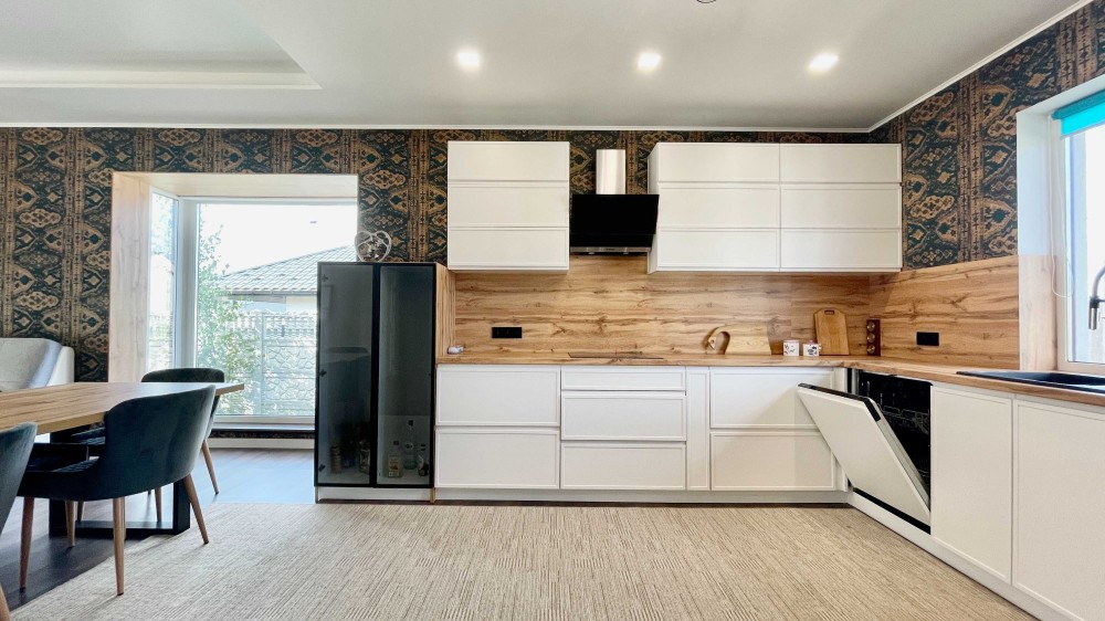 * встроенная кухня с мебелью (посудомоечная машинка, варочная поверхность, духовой шкаф, холодильник, микроволновка и вытяжка);
