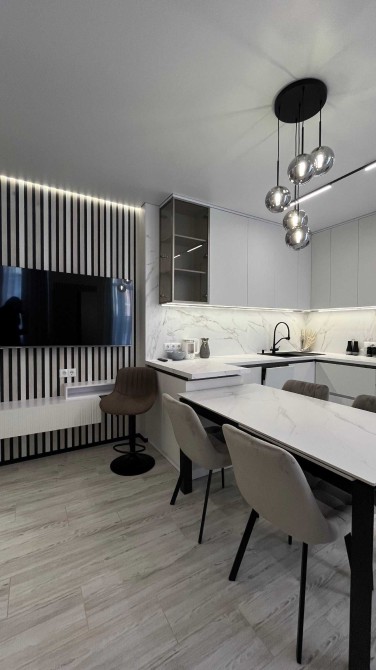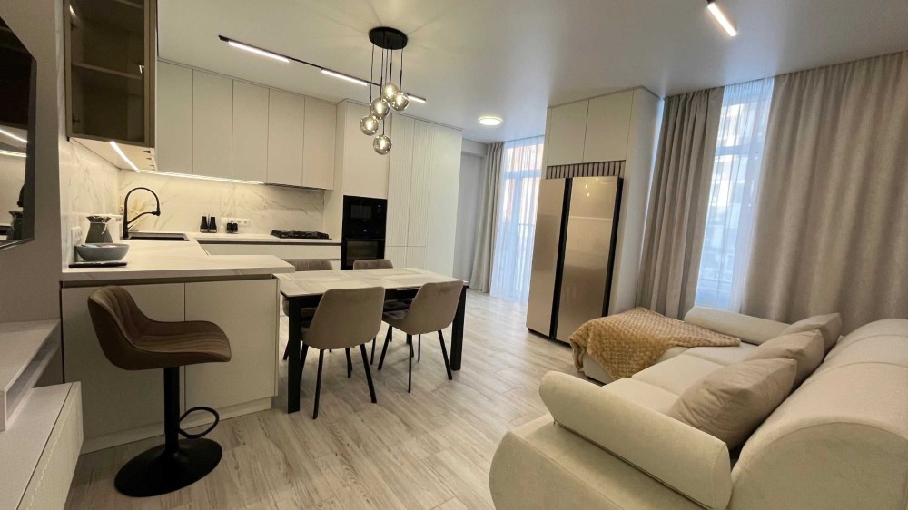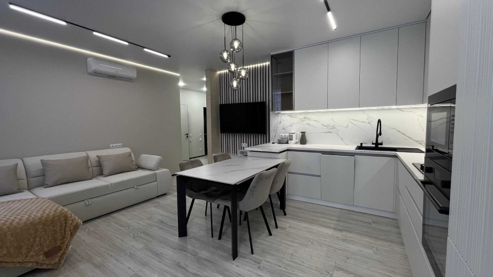 У квартирі встановлено кондиціонер, телевізор, посудомийну машину, духову шафу, мікрохвильову піч, газову плиту та великий холодильник Side by Side. Продумано багато місць для зберігання.