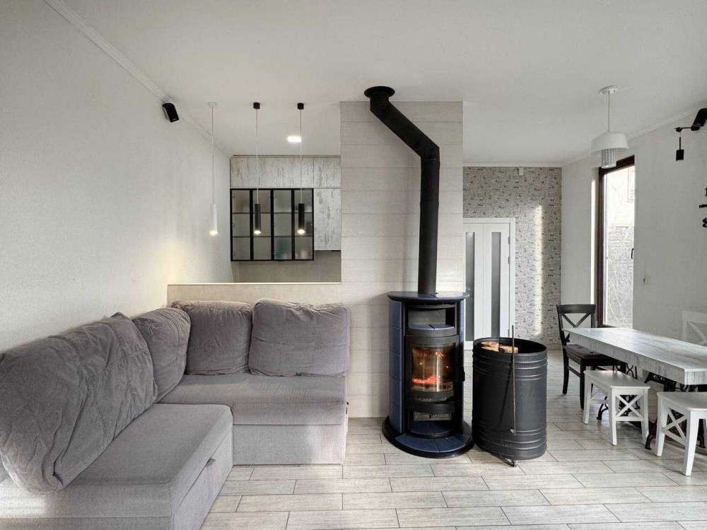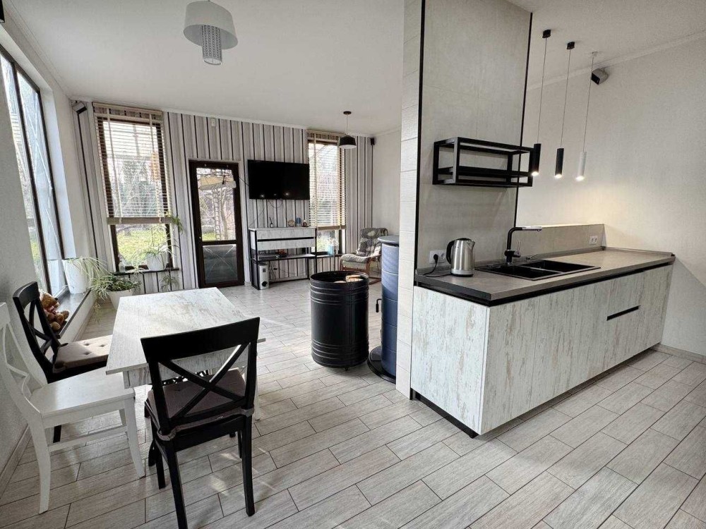 В гостьовій кімнаті відчувається затишок біля каміна, облаштовані зони для відпочинку з телевізором або зоною для читання книг. Відокремлена зона кухні та столової. На кухні є посудомийна машина, духова шафа, варильна поверхня, холодильник. В санвузлі душова, облаштована зона постірочної є пралка і сушарка білизни. Сауна.