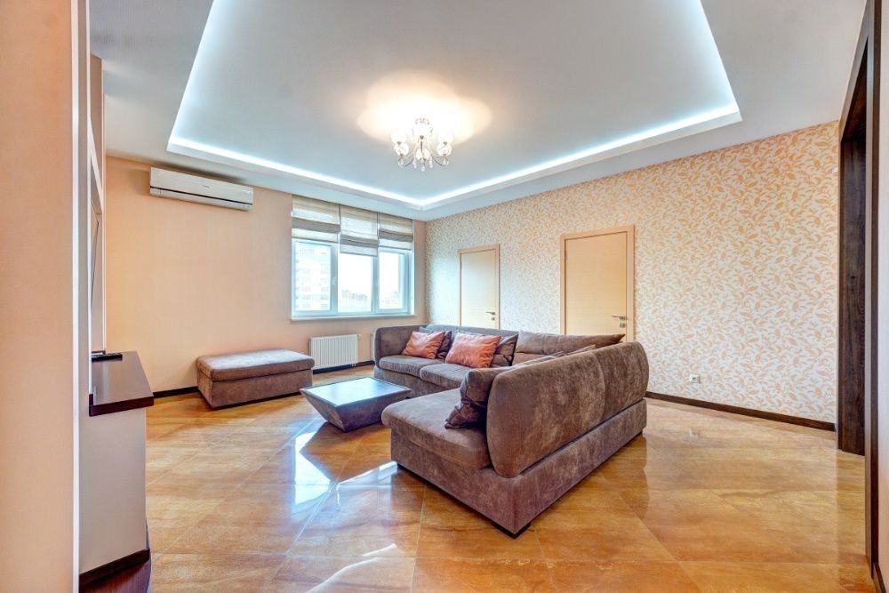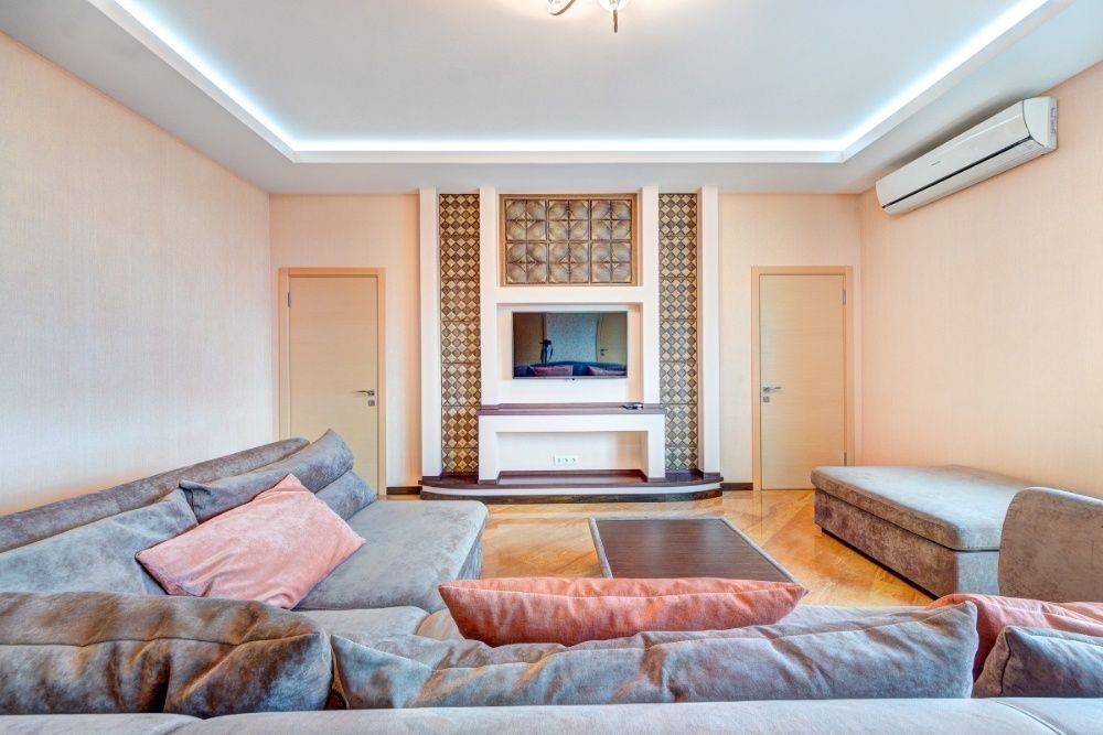 • Простора вітальня з продуманою зональністю та акцентним освітленням.