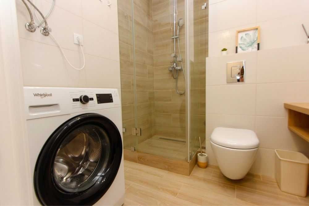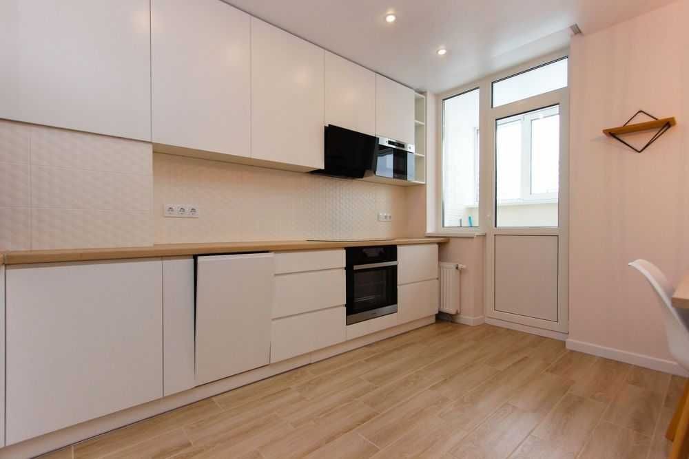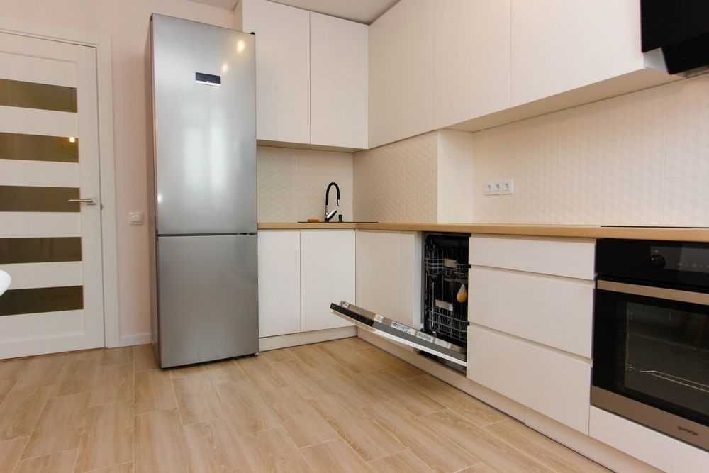 Сучасна кухня: нова посудомийна машина, мікрохвильова піч, духова шафа та індукційна плита, великий холодильник Bosh.