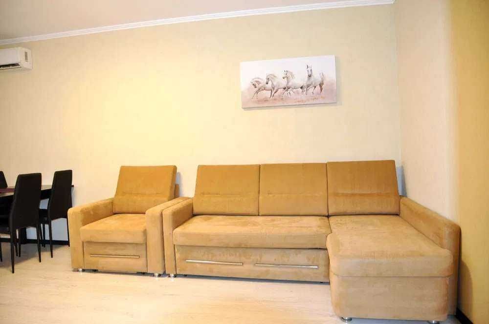Квартира повністю укомплектована всім необхідним для комфортного проживання: меблі, побутова техніка, посуд, вбудовані шафи, кондиціонер. Світла та простора, з гарним видом з вікон, без зайвих деталей.