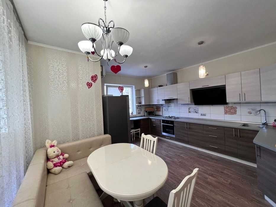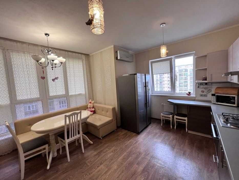 Великий коридор, велика кухня, балкон, два санвузли (один з дитячим унітазом).Квартира повністю укомплектована меблями: ліжко, диван, шафи-купе, столи, стільці. Побутова техніка: бойлер на 100 літрів, пральна машина, сушильна машина, посудомийна машина, мікрохвильова піч, варильна поверхня, духова шафа, холодильник, телевізор, три кондиціонери, пилосос, чайник, кулер для води. У дворі два дитячі майданчики. Поруч продуктові магазини, супермаркети Фора та Новус, парк, зупинка маршруток. Парковка на території комплексу. До метро Теремки – 15-20 хв на маршрутці, 7 хвилин автомобілем. Красива місцевість та екологічно чистий район.