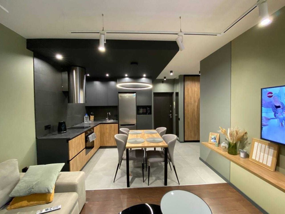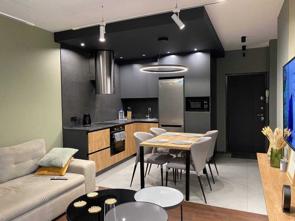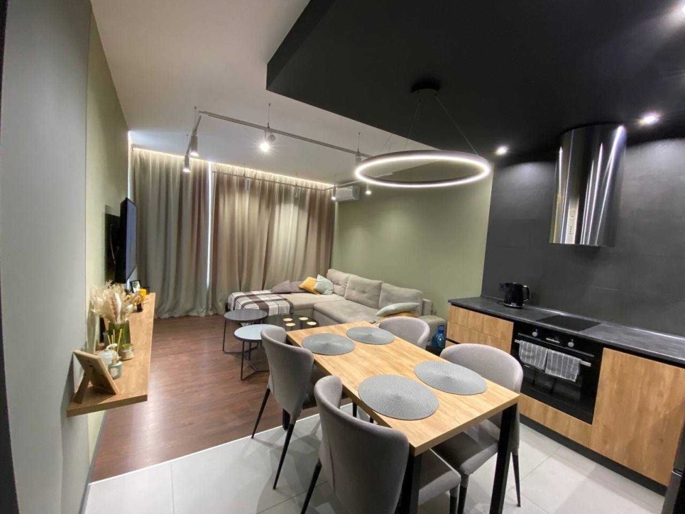 Просторе зонування: окрема обідня зона, вітальня для відпочинку, робоче місце з уже встановленим столом