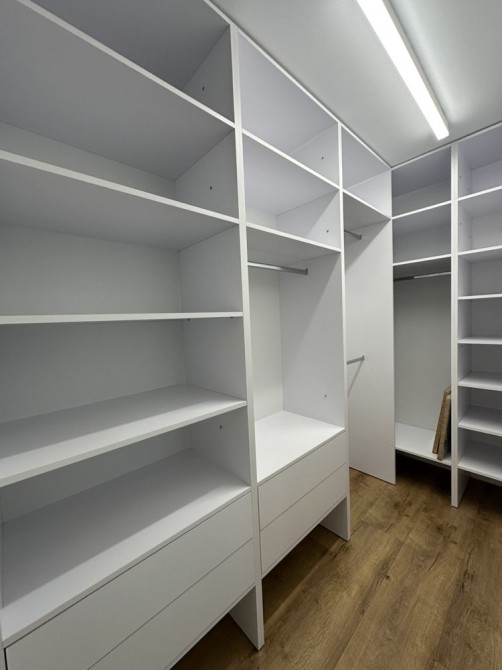 Квартира перепланована: спальня кімната з гардеробом та велика кухня-студія.