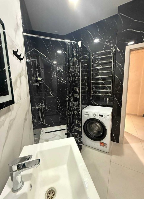 Техніка: варильна панель, духова шафа, холодильник, мікрохвильова піч, чайник, пральна машина, великий ТВ