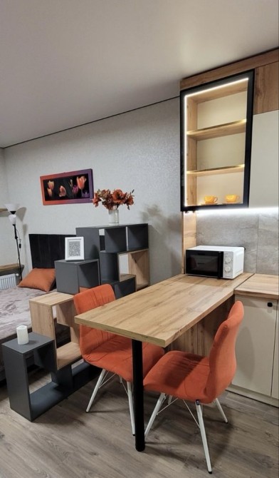 Квартира - студія повністю, праністю мебльована сучасними меблями та технікою двоспальне ліжко є велика плазма та кондиціонер, посудомтйна машина, мікрохвильовк, холодильник, та велика сучасна плазма. Якісний ремонт! Заселення можна із маленьким песиком. Ключі на руках!