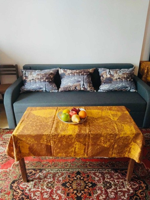 Є все необхідне: меблі, побутова техніка, посуд. Ремонт робився для себе, з використанням екологічних і якісних матеріалів. Меблі з натурального дерева, на підлозі — великий вовняний килим.