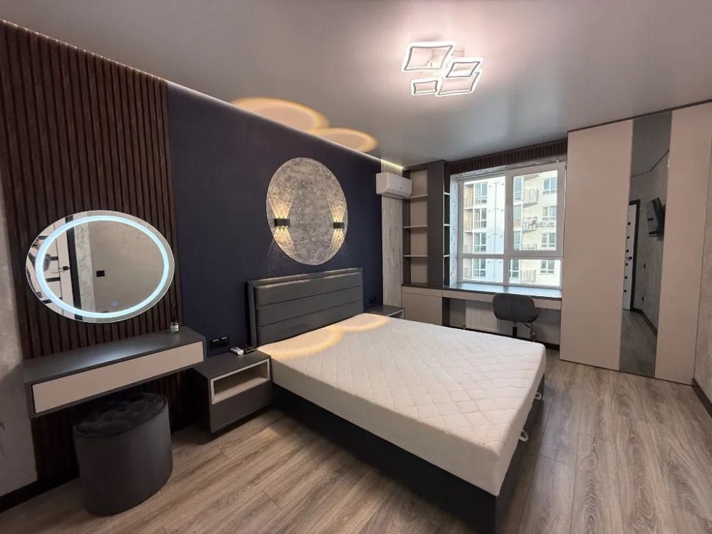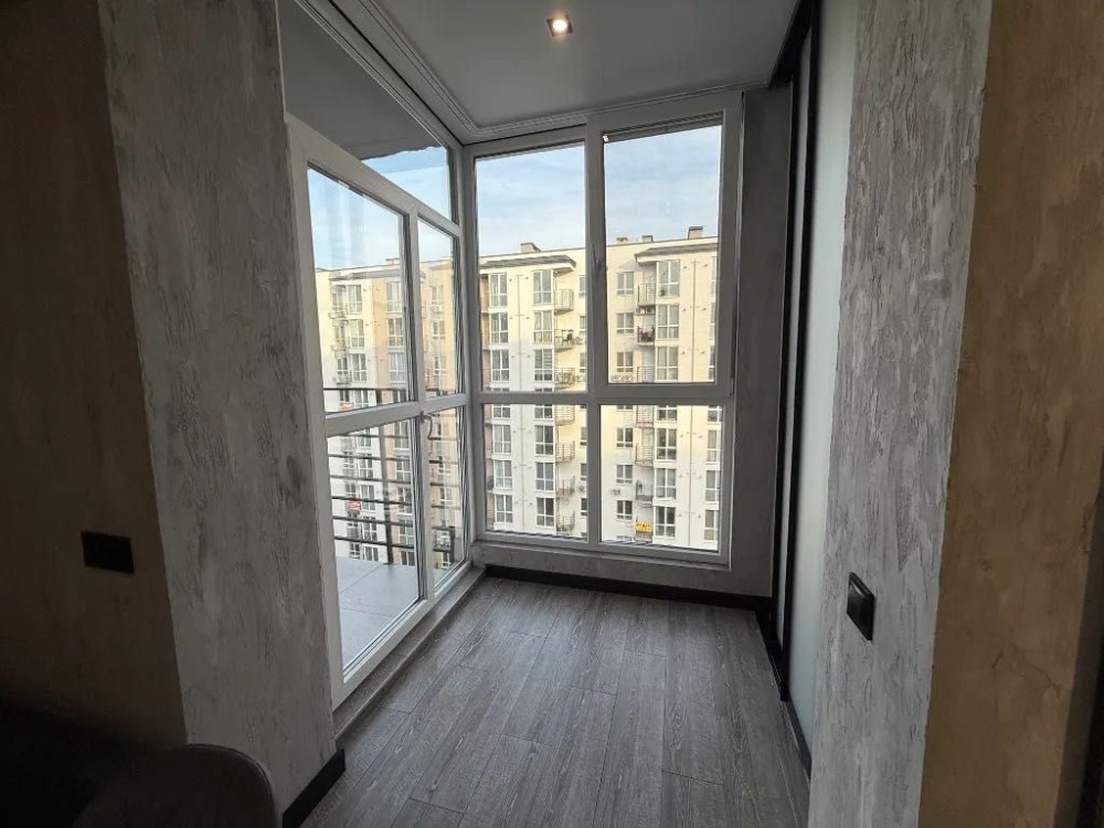 Планування: кухня-вітальня з лоджією, окрема спальня з робочою зоною, гардероб, суміжний санвузол. Балкон. Закритий двір, охорона, паркінг.