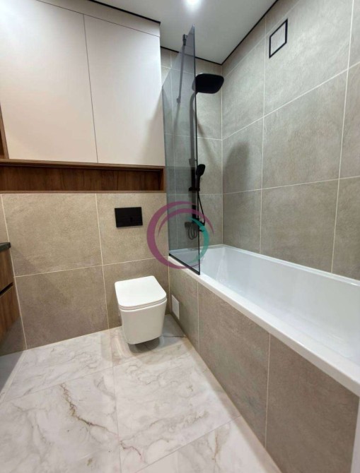 Ванна кімната простора, виконана в сучасних та теплих відтінках. Встановлена велика ванна, пральна машина, санвузол, умивальник — усе підібрано зі смаком та увагою до деталей.