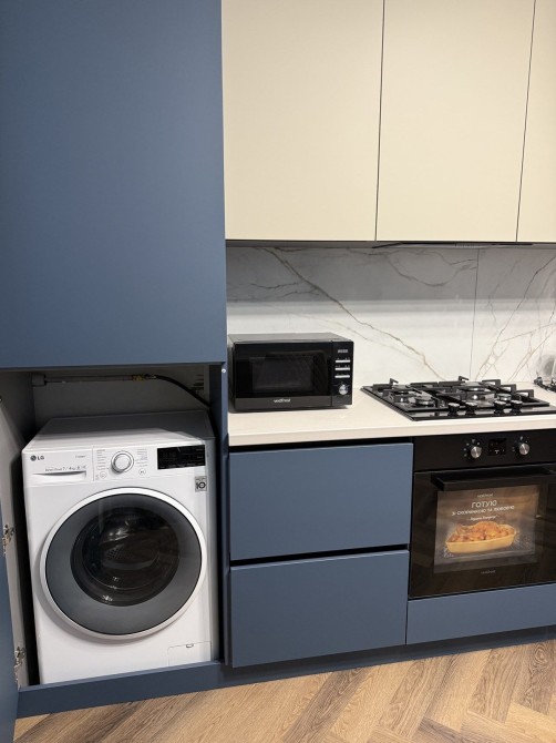 Нова техніка: холодильник, духовка, варильна поверхня, мікрохвильовка, пральна машина.