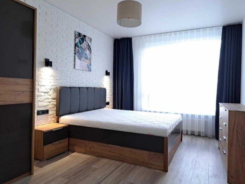 Квартира розташована на 9 поверсі новобудови. Загальна площа 48 квадратних метрів. Планування включає ізольовану спальню та простору кухню-студію.