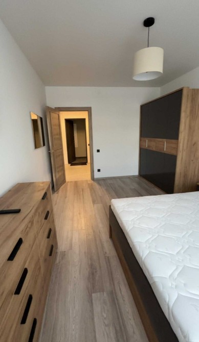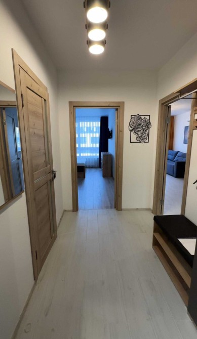 Спальня окрема, з великим двоспальним ліжком та місткими шафами для зберігання речей. Санвузол обладнаний ванною та пральною машиною. Коридор стильний і функціональний, з додатковими місцями для зберігання.