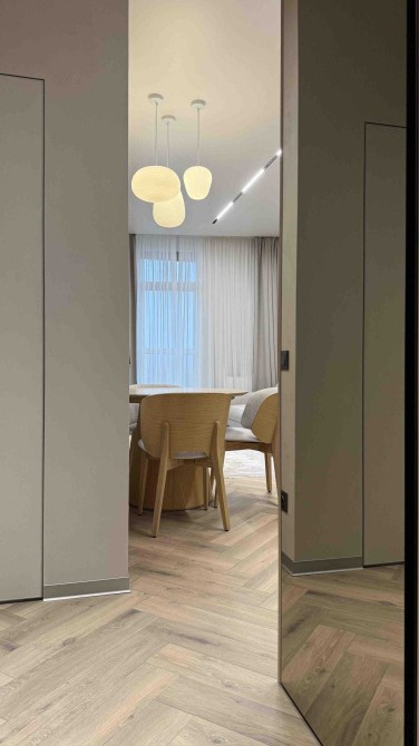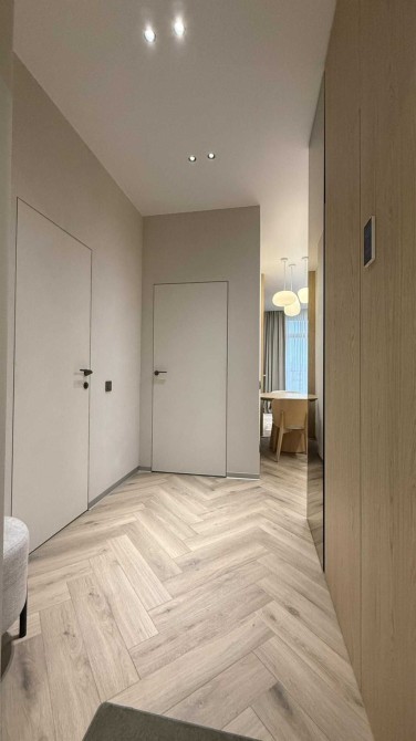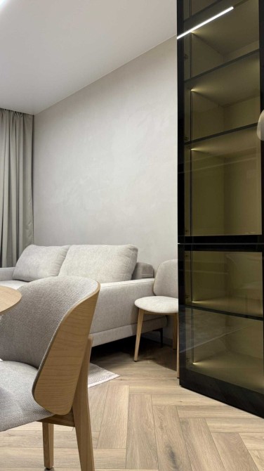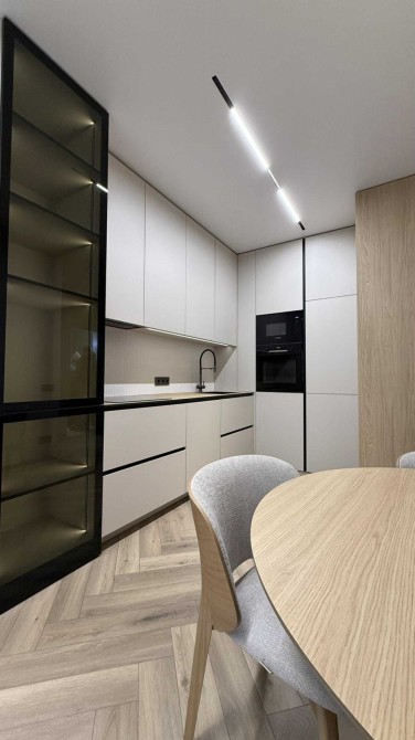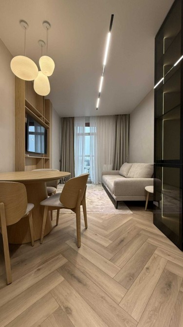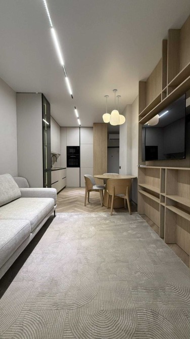 Простора кухня-студія з розкладним диваном, телевізором Smart TV та великою кількістю сценаріїв освітлення. Підігрів підлоги в зоні балкона та санвузла.