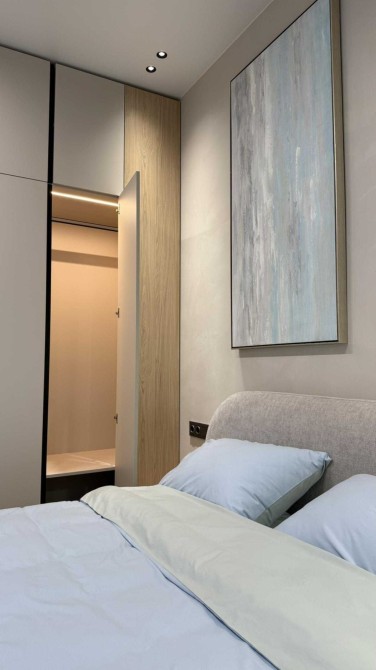 Окрема спальня з великим двоспальним ліжком, місткою шафою з підсвіткою та дизайнерськими світильниками.