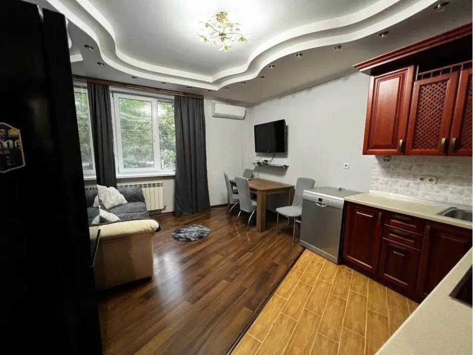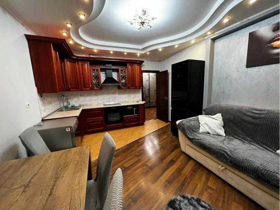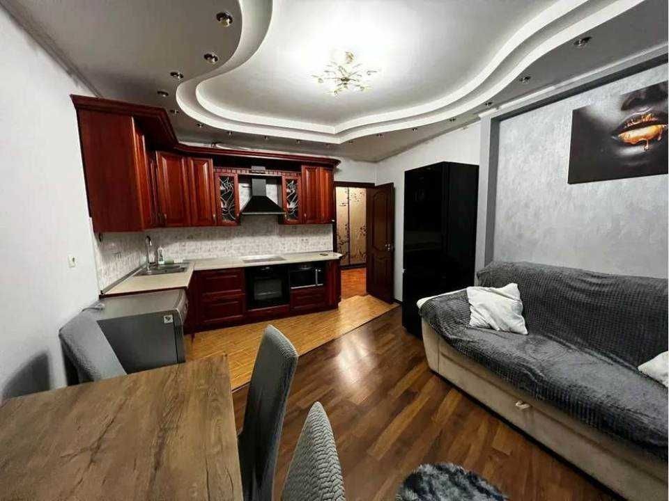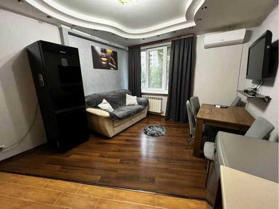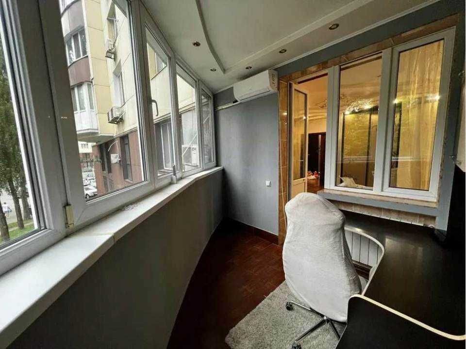 Простора квартира з євроремонтом, що включає окрему кімнату та кухню-студію. Лоджія облаштована під кабінет, створюючи додатковий простір для роботи чи відпочинку.