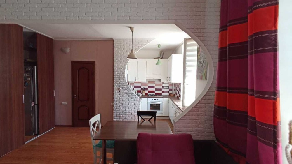 Кухня-студія: об'єднана з вітальнею, повністю укомплектована необхідною побутовою технікою (газова плита, духова шафа, холодильник). Зона вітальні обладнана зручним диваном та обіднім столом.