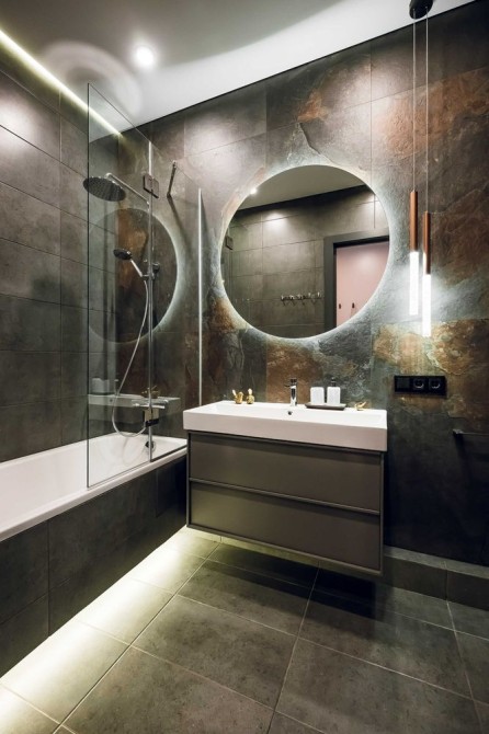 • Декор: абстрактні картини, сучасні люстри, натуральні відтінки оздоблення (сірий, теракотовий, мідний)