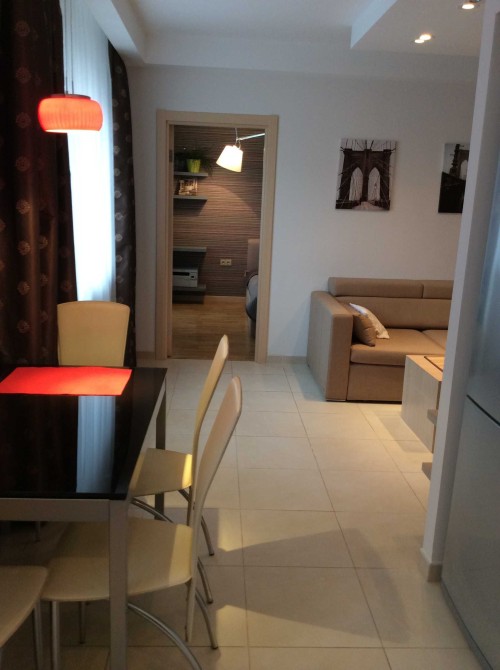 Простора кухня-студія з розкладним диваном і великим телевізором, спальня з двоспальним ліжком, телевізором, робочим місцем і гардеробною, санвузол-суміжний, утеплений балкон.