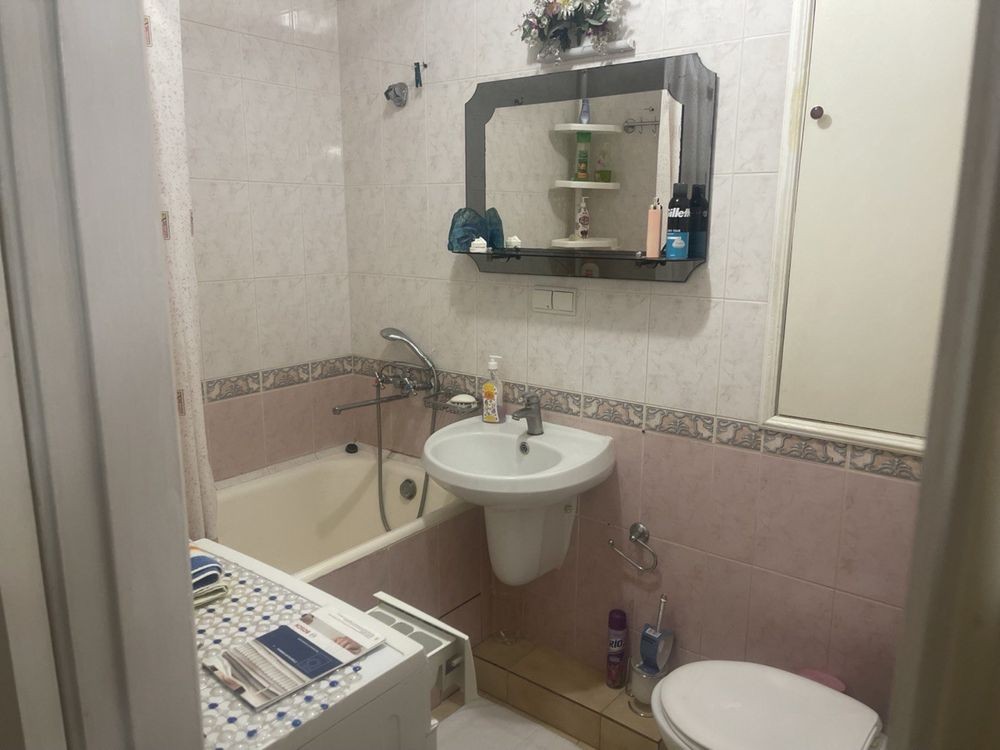С/в суміжний. Плитка світлого кольору. Пральна машина, ванна.