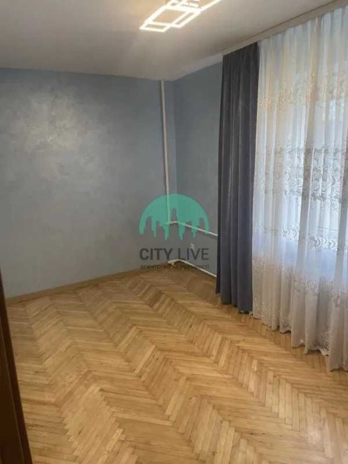 • Простора кімната з паркетною підлогою "ялинкою".
