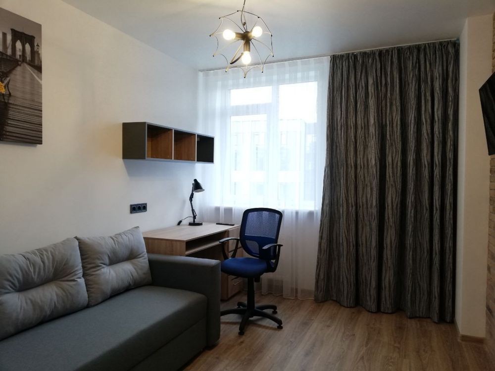 Друга кімната з диваном та робочим місцем.