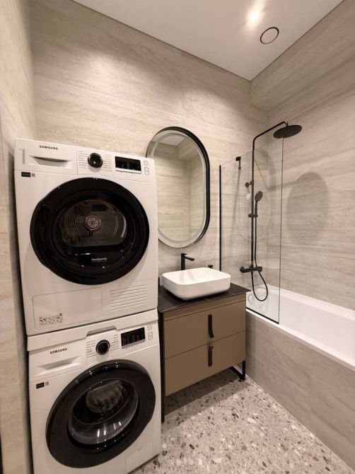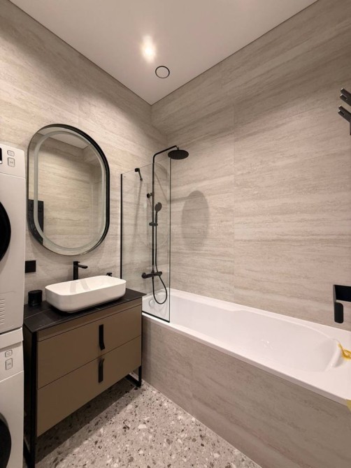 • ванна кімната з сучасною сантехнікою, душовою кабіною/ванною, пральною машиною,