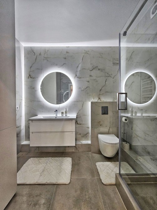 Санвузол обладнаний бойлером на 100 літрів, душовою кабіною, пральною машиною, сушаркою для рушників з регулятором температури та дзеркалом із сенсорною підсвіткою.