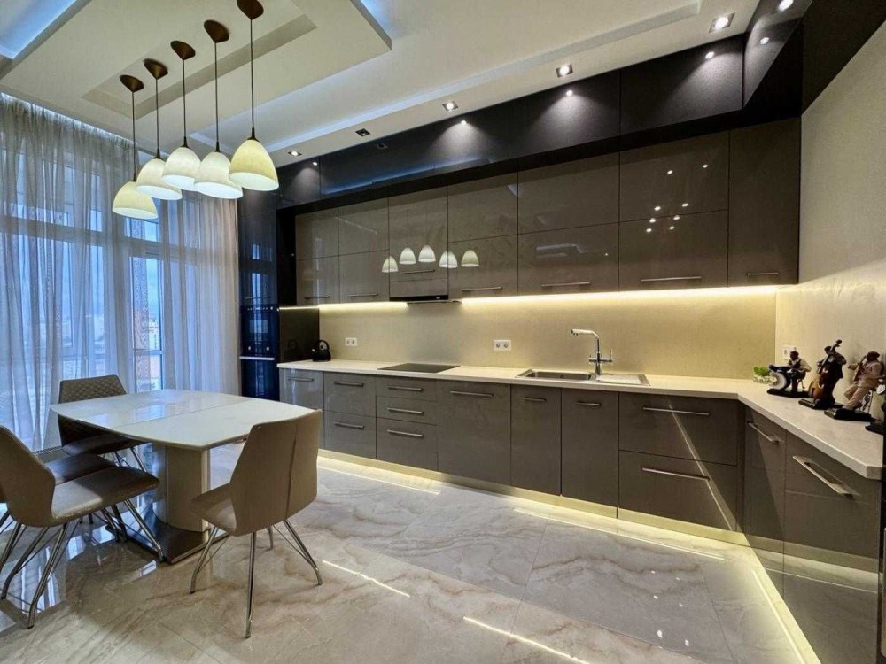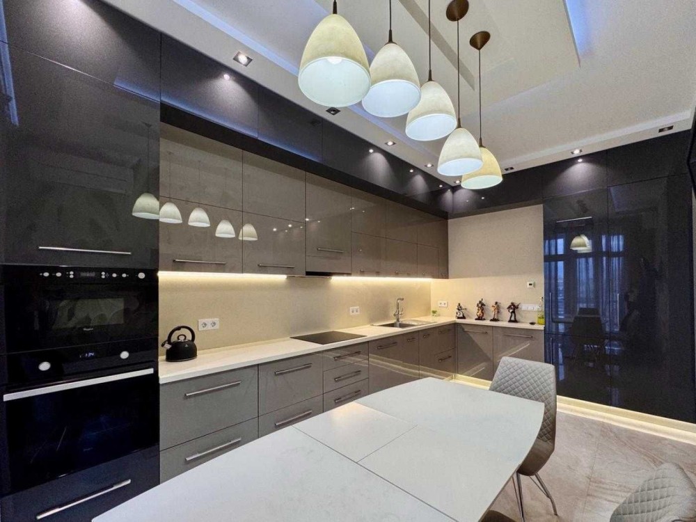 Кухня обладнана: варильна поверхня, духова шафа, мікрохвильова піч, посудомийна машина, холодильник