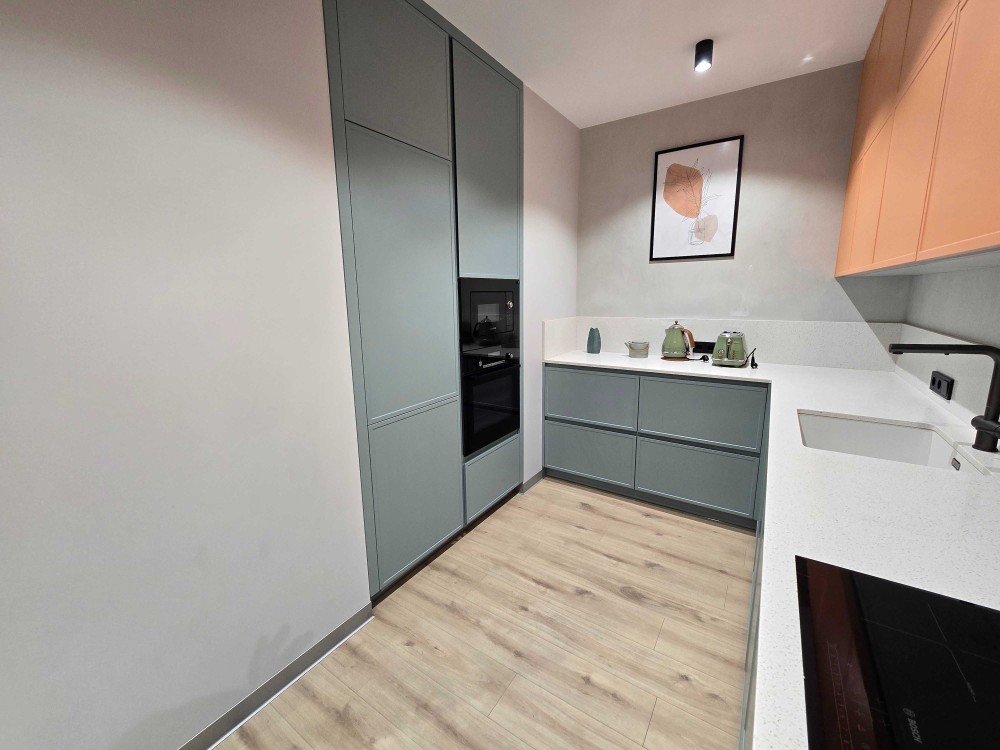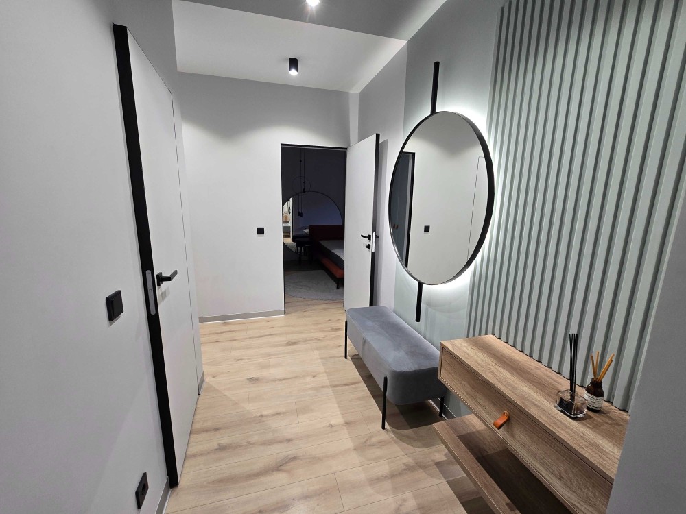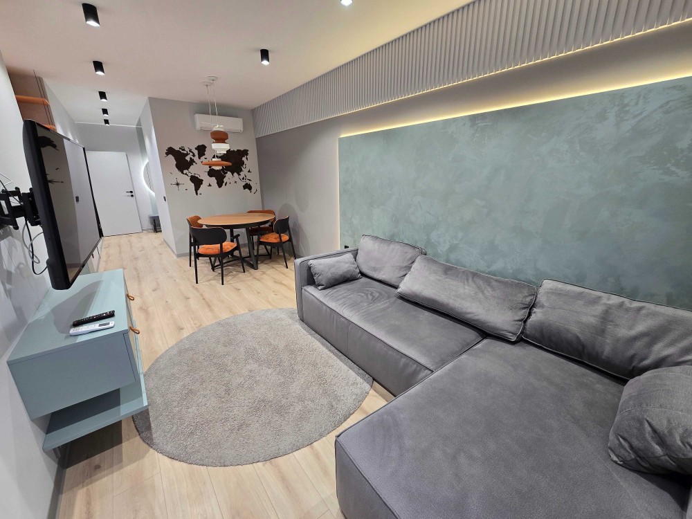 Кухня – вітальня, з диваном та повноцінною кухнею, дитяча кімната/кабінет, окрема спальня з балконом.