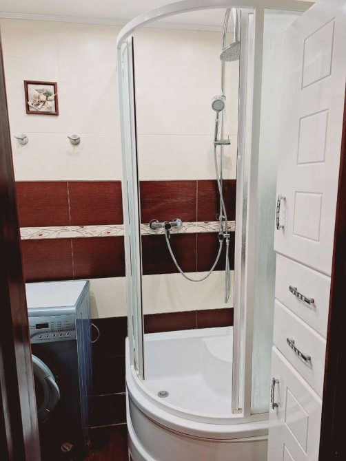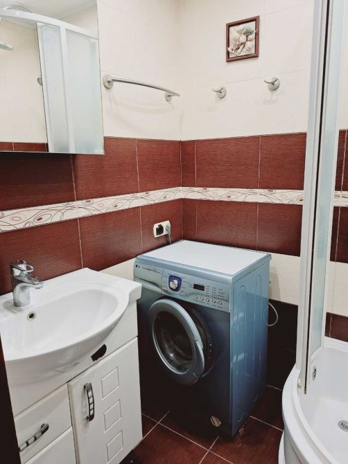 Санвузол: душова кабіна, умивальник з дзеркалом, пральна машина та бойлер.