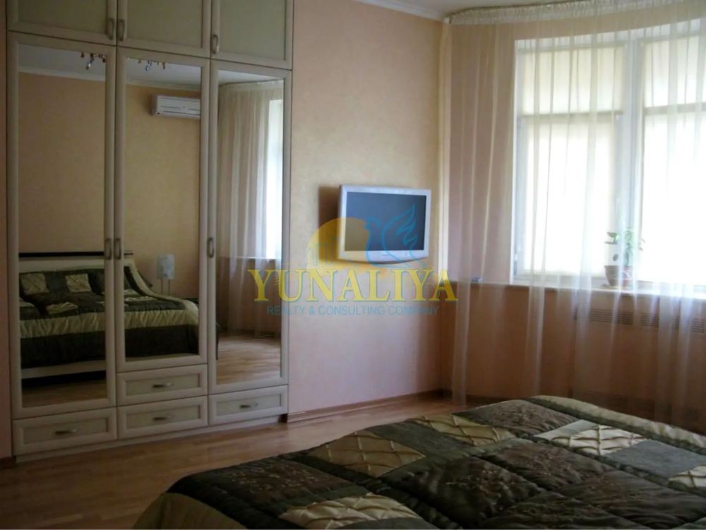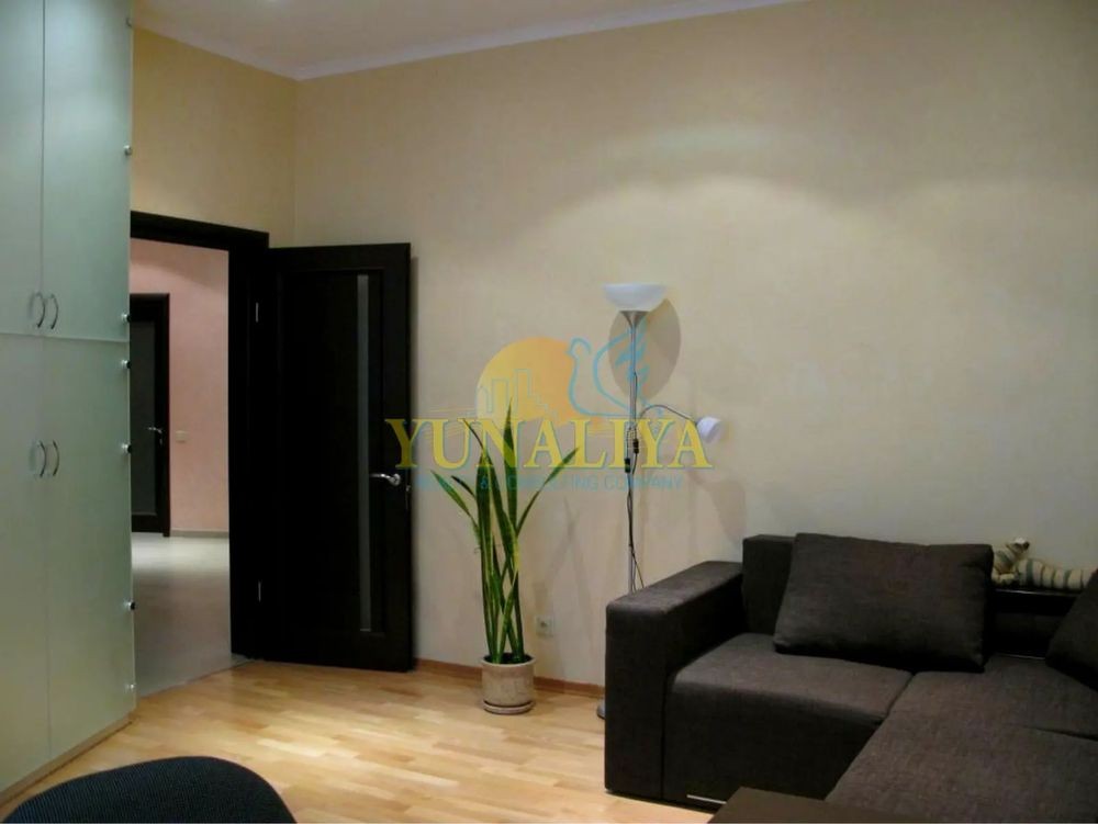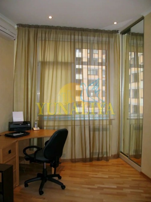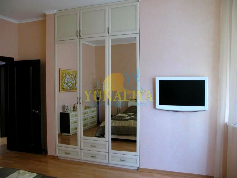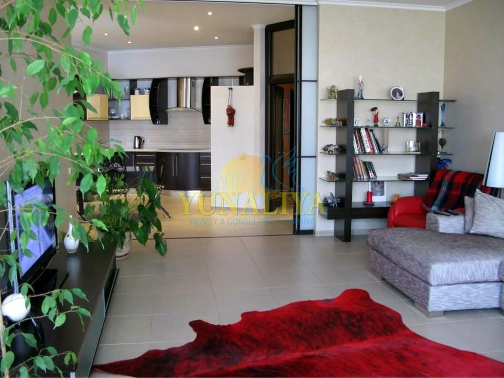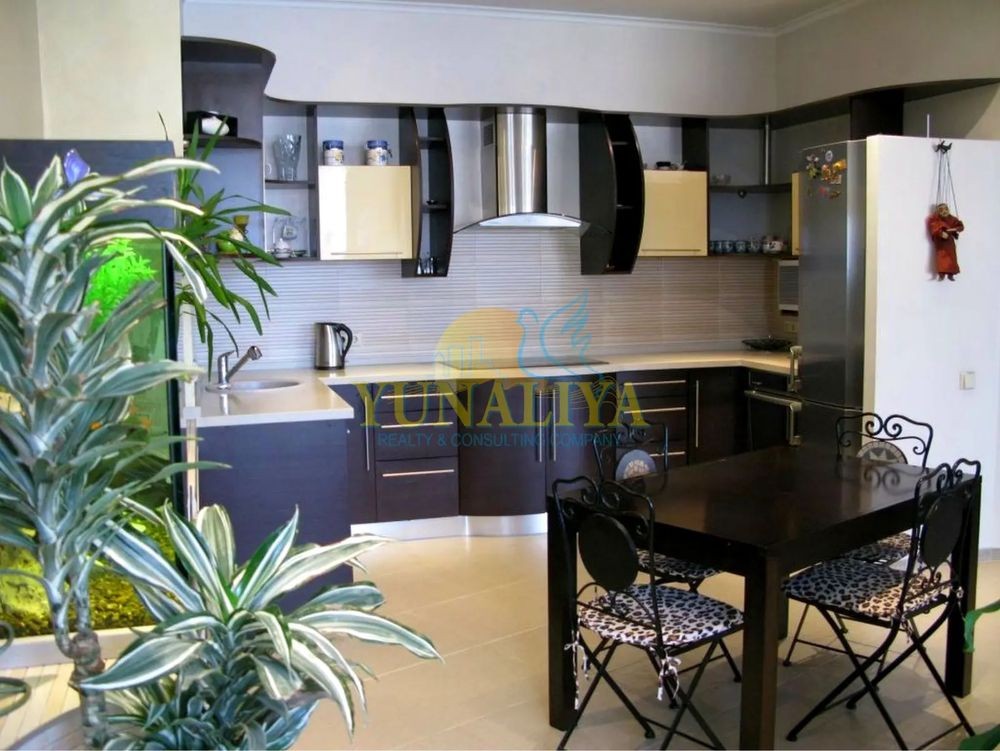 БЕЗ КОМІСІЇ! 7/14-поверховий цегляний будинок із закритою охороною. S - 126,7 м². Планувальне рішення: відкритий простір вітальні та кухні-їдальні, S - 53,7 м², спальня - 22,7 м², кабінет (дитяча) - 19, 3 м², 2 с/в. Дизайнерський ремонт. Підлога з підігрівом, 4 кондиціонери, зимовий сад, акваріум, супутникове TV, Internet. Квартира мебльована і обладнана побутовою технікою.