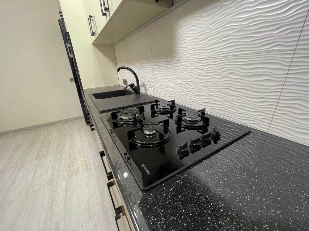 Кухня з комплектацією: холодильник, мікрохвильова піч, духова піч, варильна газова поверхня, витяжка