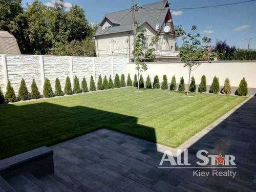 На ділянці — доглянутий зелений газон, декоративні дерева, вимощені доріжки та навіс для авто.