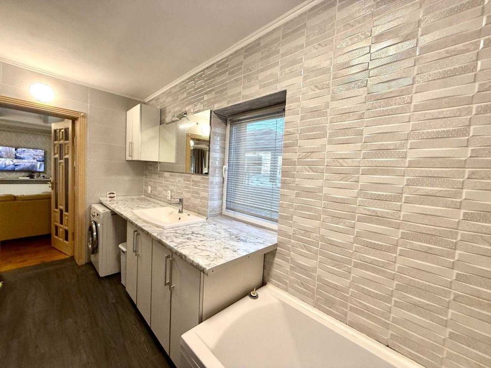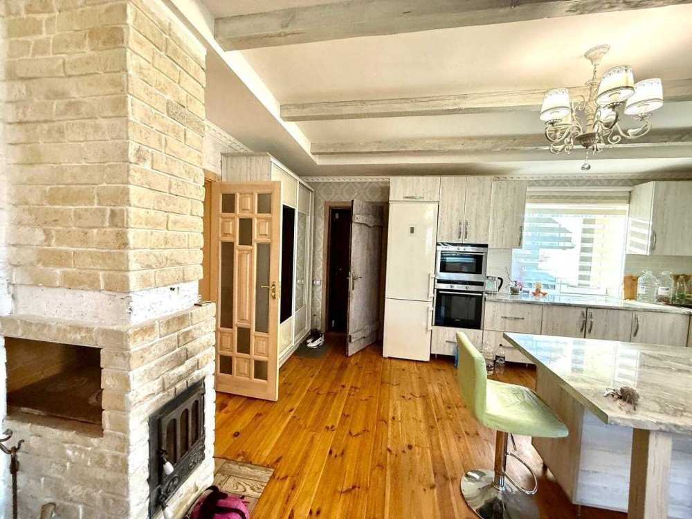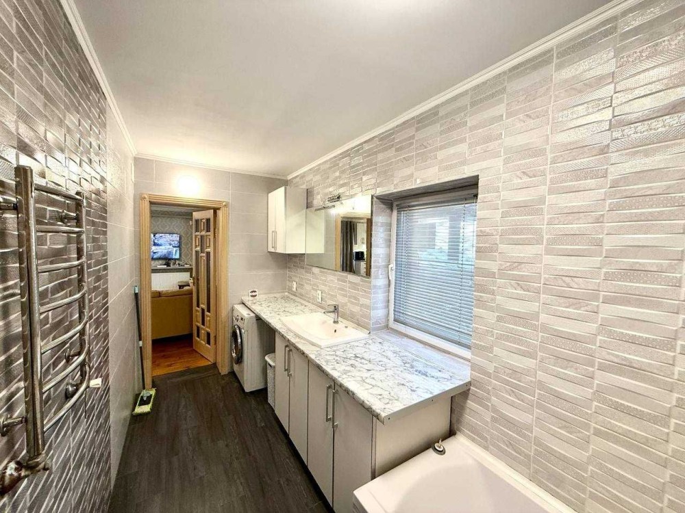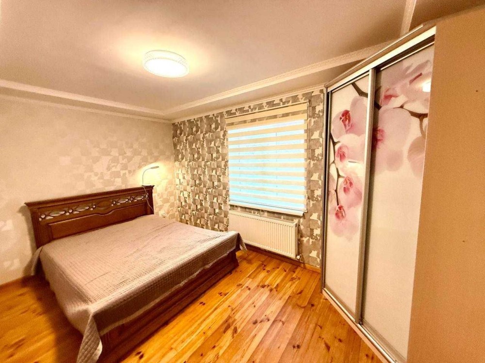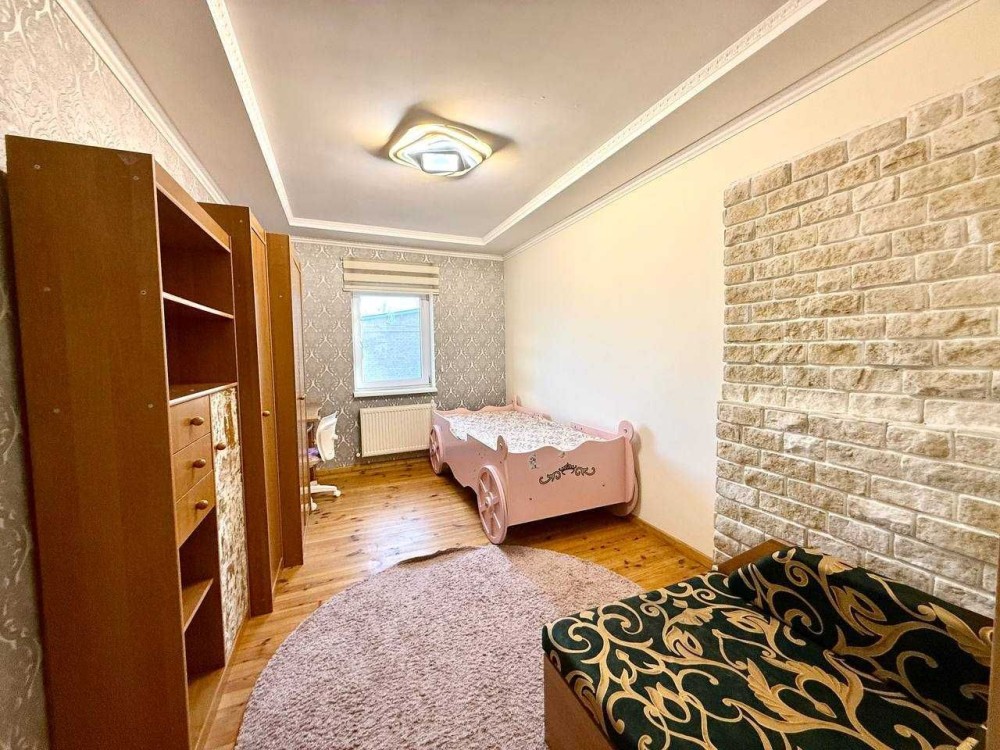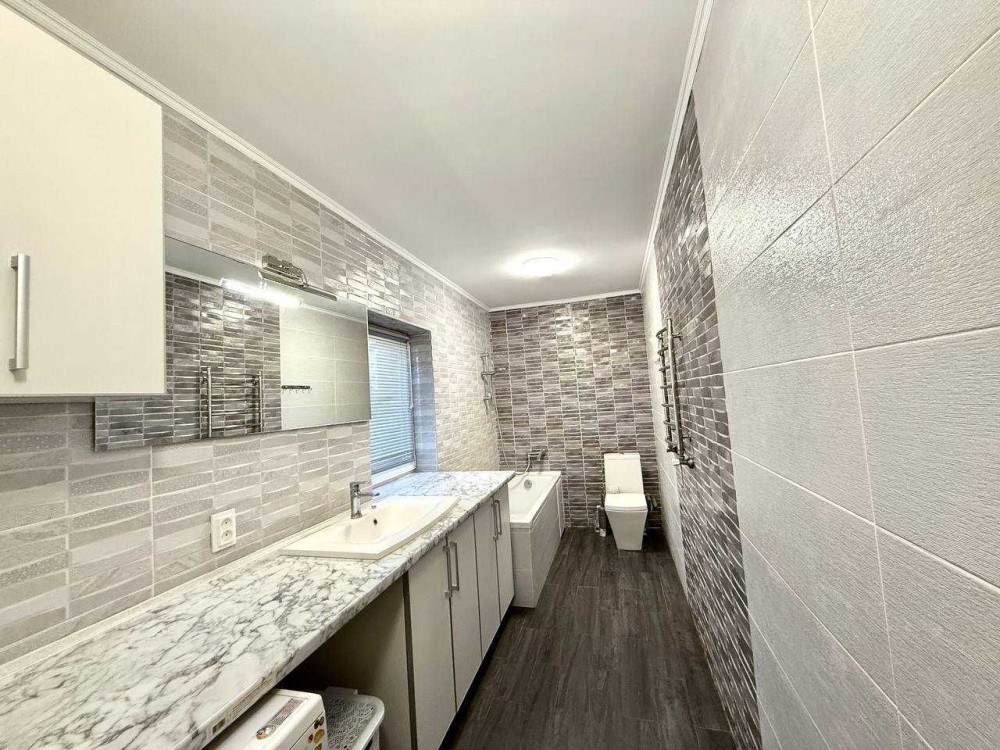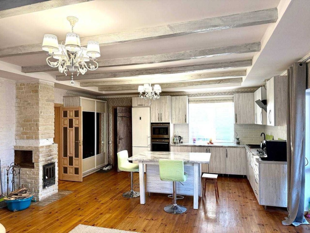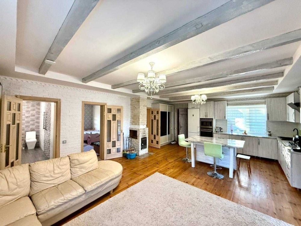 І так сам будинок 90 квадратних метрів, складається з великої кухні-студії та залу, яка 40 квадратних метрів, двох спалень та ванної. Спальна велика одна, батьківська та дитяча. Ванна повноцінна велика довга з самою ванною.