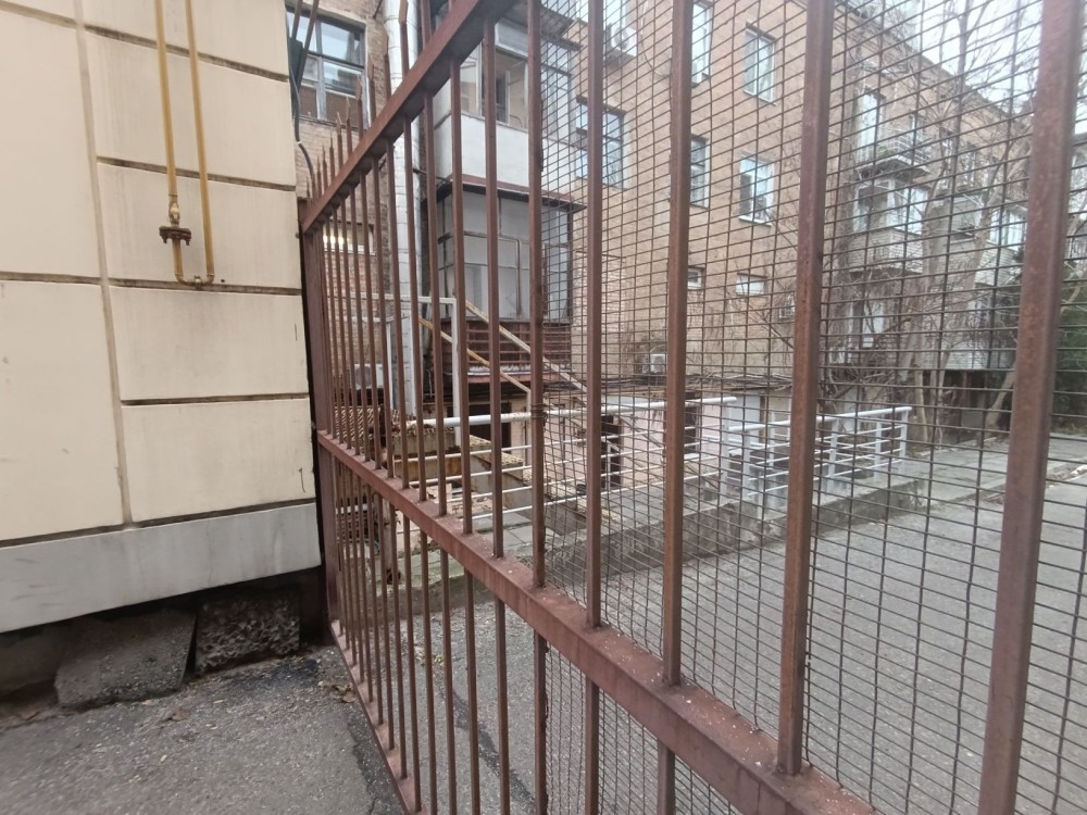 Вітринні вікна з решітками, ролети на вхідних дверях.