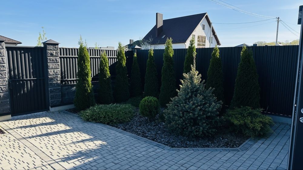 Паркан, у дворі бруківка, газон, хвойні рослини, фруктові дерева. Також є контейнер для зберігання господарського інвентаря.